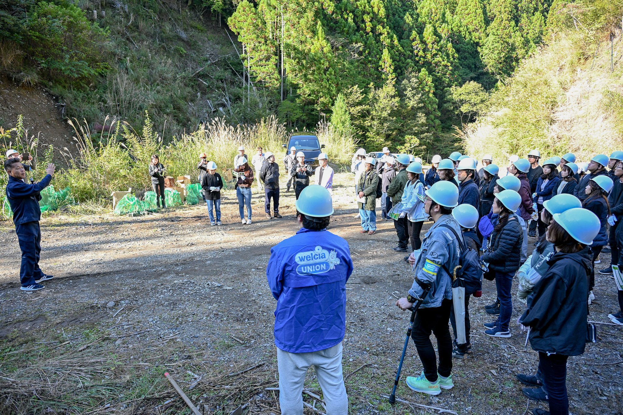 この事業では、都市部の企業や団体から施業費用の支援を受けるとともに、植栽活動の一部を協働で行います。ドラッグストア大手「ウエルシアホールディングス」の労働組合「ウエルシアユニオン」(茨城県つくば市)を招き、植樹体験会を開催しました。