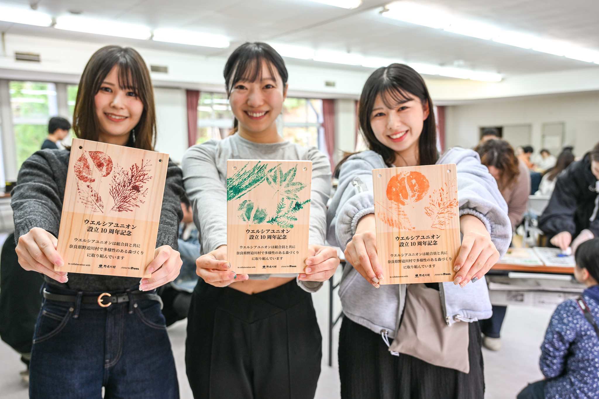 また、採取した広葉樹の葉脈を絵の具で写し取って記念プレートを作る催しも行われ、 参加者は森と人との新たな関係づくりを体感しました。