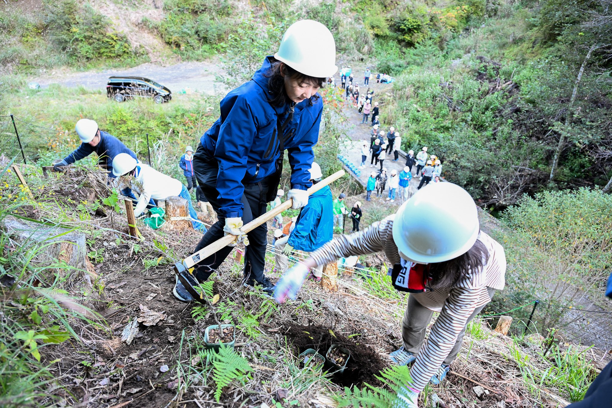 当日は、宮城から広島まで全国各地から65人が参加。 植樹は約0.03ヘクタールの斜面の一角で行われ、森林組合職員らの手ほどきを受けながら、参加者は掘った穴に苗木を入れ、落ち葉が入り込まないよう注意しつつ、丁寧に土をかぶせました。
